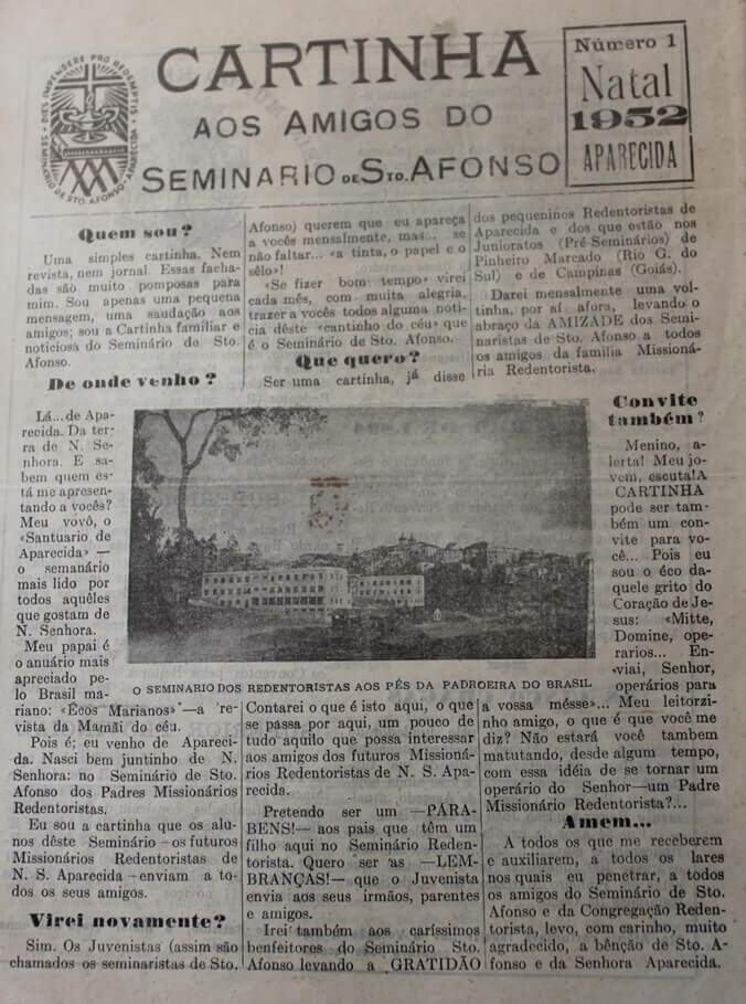 A Cartinha é, portanto, um veículo de comunicação do Seminário Santo Afonso. Segundo André Brisola Junior, aspirante redentorista, a revista surgiu de uma forma informal e traz essa característica até hoje. “A ideia é que a Cartinha leve aos pais, aos benfeitores e aos amigos do Seminário Santo Afonso o cotidiano, os acontecimentos, aquilo que interessa aos seminaristas e àqueles que o acompanham”.