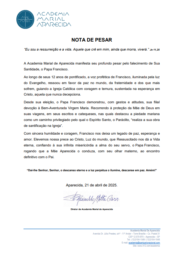 Com o anúncio do falecimento de Sua Santidade, a Igreja Católica em todo o mundo se une em oração pelo seu descanso eterno. O Pe. Rosivaldo Motta, C.Ss.R, em nome da Academia Marial de Aparecida (AMA), manifestou seu pesar e destacou o legado deixado pelo sucessor de Pedro: