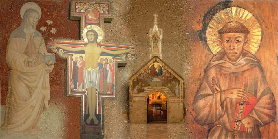A hodierna e majestosa Basílica de Santa Maria dos Anjos abriga no seu interior a pequena Capela da Porciúncula, local onde Francisco confirmou a sua vocação numa noite do ano 1216. O nome de Santa Maria dos Anjos provém da tradição de que, naquela pequena Capela, que foi construída por quatro peregrinos que retornavam da Terra Santa, era venerado um fragmento do túmulo da Virgem Maria, e que sempre se ouvia no local o canto dos anjos. Foi também nesta pequena Capela, que recebeu o nome de Porciúncula, isto é, pequena porção, que São Francisco recebeu a indulgência do “Perdão de Assis”. Conta-se a história desse momento místico da vida de São Francisco: estava certa noite em sua cela, rezando pela conversão dos pecadores, quando um anjo convidou a dirigir-se à Capela da Porciúncula. Lá chegando, encontrou-a toda iluminada e no meio de um coro de anjos estava a Virgem Maria ao lado de seu Divino Jesus.