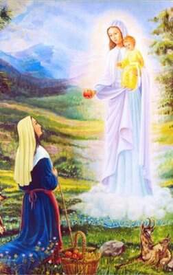 "Benoite conduziu o rebanho para o local indicado, o Vallon des Fours (Vale dos Fornos), assim chamado porque o alto do morro continha gesso, que os habitantes da aldeia extraíam e preparavam para utilizar em suas construções. Benoite tinha chegado apenas à frente de uma pequena gruta que estava no local quando ela viu uma Senhora de beleza incomparável trazendo uma não menos bela criança em suas mãos. Ela ficou encantada com a visão. Apesar da previsão de São Maurício do dia anterior, a ingênua menina pastora não podia imaginar que estava agora na presença da Mãe de Deus. Pensou que estava diante de uma mera mortal, e disse muito inocentemente: 'Bela Senhora, o que está fazendo aqui? Veio comprar gesso?' Em seguida, sem esperar por uma resposta, ela acrescentou com espontaneidade: 'A Senhora faria a gentileza de nos deixar pegar esta criança? Este menino iria nos deliciar a todos!' A dama sorriu, sem responder. Fascinada, Benoite admirava a bela Senhora. Chegando o momento de sua refeição, ela tomou um pedaço de pão e disse: 'A Senhora gostaria de comer comigo? Eu tenho aqui alguns pãezinhos muito gostosos.' A Senhora sorriu novamente e continuou deixando Benoite desfrutar de Sua presença, indo e vindo para fora da cavidade da rocha da gruta de onde apareceu. Benoite aproximava-se e se afastava dela. Depois, ao cair da tarde, a Senhora tomou a criança nos braços, entrou na gruta e desapareceu”.3