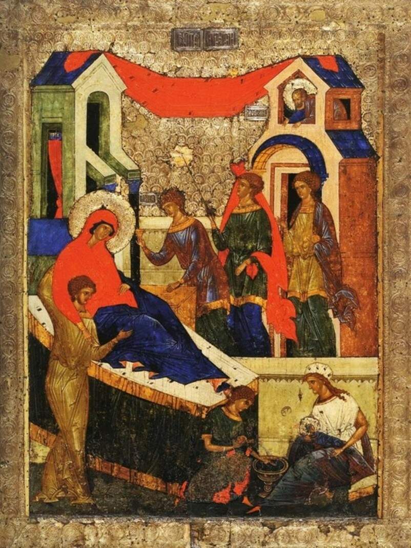 O ícone da Natividade de Jesus é um evento cósmico, um louvor da criação e dos homens ao Verbo que se fez carne, ao Menino-Deus. A Natividade da Virgem Maria acontece em um ambiente doméstico; é uma cena íntima e familiar que destaca valores fundamentais para a Igreja: o matrimônio e a família.