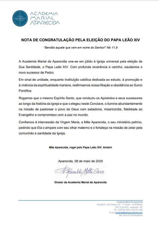No Brasil, o Missionário Redentorista Pe. Rosivaldo Motta, C.Ss.R., diretor da Academia Marial de Aparecida, publicou uma nota de congratulação pela eleição do Sumo Pontífice, na qual, em nome da associação, saúda publicamente e acolhe o Papa eleito. O sacerdote enfatiza e reafirma a obediência e filiação afetiva ao Bispo de Roma por parte da instituição. Confira o texto na íntegra: