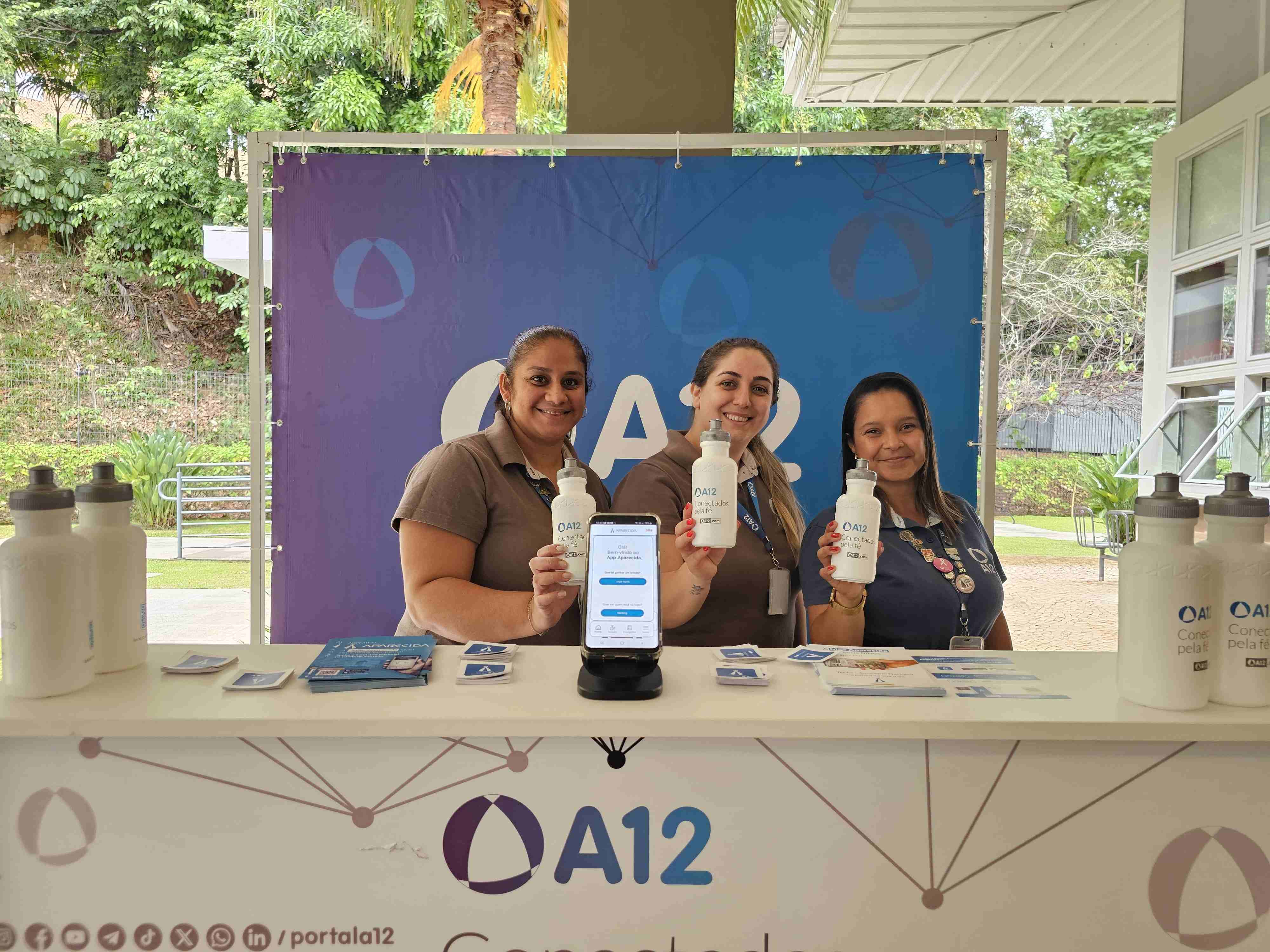 Um estande foi montado para proporcionar aos colaboradores uma experiência prática e interativa com o Aplicativo Aparecida: quem interagir com a equipe, participar do Game e baixar o app, ganha uma squeeze personalizada do Portal A12.
