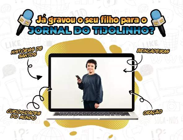Agora, o Jornal do Tijolinho está ainda mais especial, com a participação das crianças! Seu pequeno pode ser um Repórter Mirim, gravando vídeos com temas que ele ama, como milagres de Nossa Senhora, brincadeiras, curiosidades sobre sua cidade, orações favoritas e receitas feitas com a família.