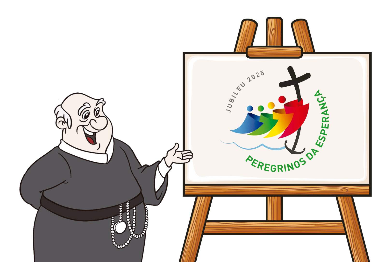 O símbolo do Jubileu representa a humanidade unida pelos quatro cantos da Terra, com figuras que se abraçam em um gesto de solidariedade e fraternidade.