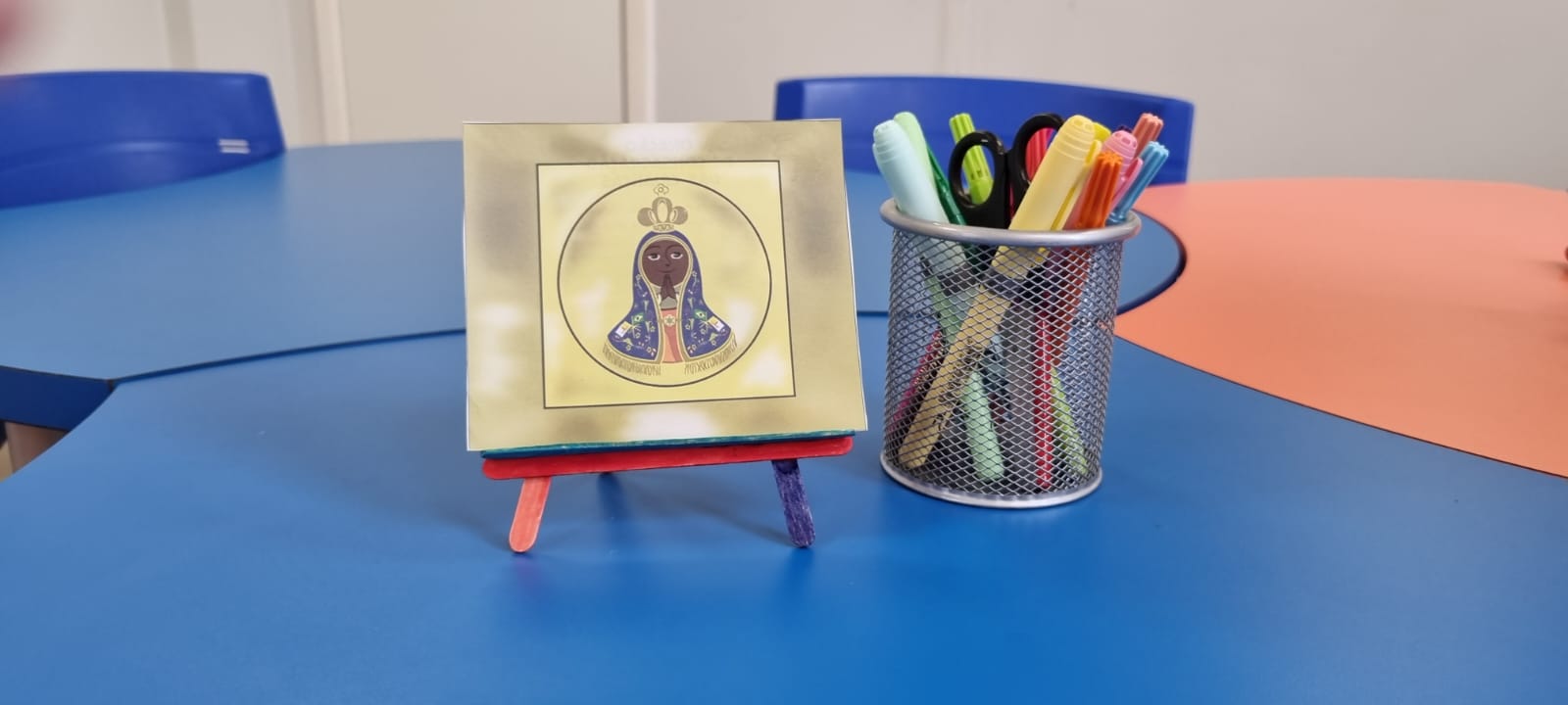 Com ele, você pode trocar olhares e ainda fazer uma Oração de Consagração das Crianças, que está atrás do nicho.