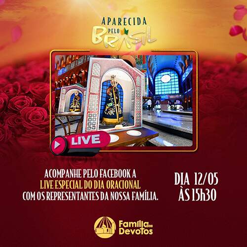 Às 15h30, teremos uma live especial no Facebook da Família dos Devotos, com a oração do Santo Terço com os representantes da família, junto com o Irmão Carlos Cunha, C.Ss.R., Ecônomo Adjunto do Santuário Nacional de Aparecida, e com a apresentadora da TV Aparecida, Dani Espíndola.