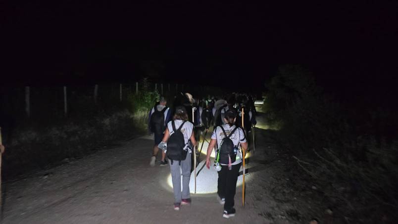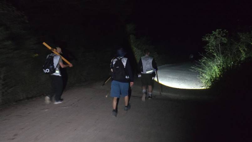 A noite toda os carros de apoio iam e vinham dando suporte, oferecendo água e aliviando o peso das mochilas e bolsas quando solicitado. A ambulância, embora não tenha sido necessária nesse primeiro dia, também esteve junto dos carros para qualquer imprevisto na estrada.