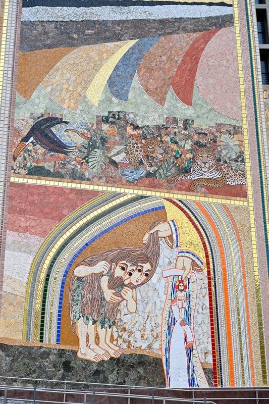 Deus vê a fragilidade do homem, então o reveste com túnicas de peles de animais, para protegê-lo em sua vulnerabilidade. No mosaico vemos que com uma mão Deus reveste Adão e Eva com túnicas de pele de animal. A morte entrou na natureza como o fim de tudo, e o homem fará de tudo para evitá-la. Mas não há como superar a morte.
