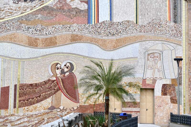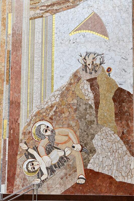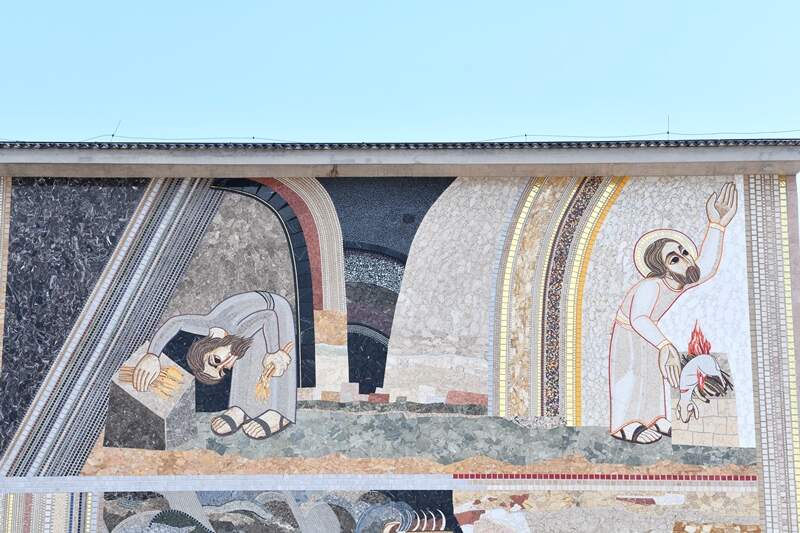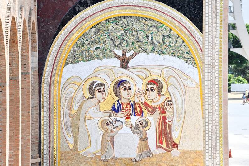 À frente da arcada da Fachada Leste, observa-se o mosaico nas duas colunas da entrada da Basílica, que praticamente desenha os capitéis. No primeiro capitel, à esquerda, está escrito Ômega e à direta Alfa. O fim que é Ômega no início, por quê? Porque essa linguagem, essa palavra que é Cristo, só pode ser compreendida a partir do fim. Só entendemos a Criação pela Redenção.
