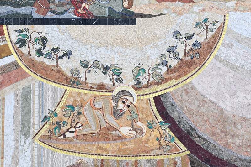 Esse mosaico nos mostra que a terra não é mais o jardim extraordinário em que Deus o colocou para ser seu guardião. De fato, o Senhor preparou cuidadosamente toda a criação precisamente para colocar o homem, rei e senhor de tudo o que foi criado na terra para governar e servir. Em vez disso, o pecado mudou o cenário. Ao invés de servir, o homem quer consumir e explorar, mas começa a experimentar a terra como algo hostil, que não favorece a existência - "Maldito seja o solo por sua causa!" (Gn 3,17). Essa imagem nos apresenta uma outra consequência, a inimizade de Adão com os animais ferozes porque também a sua natureza mudou com o pecado do homem.