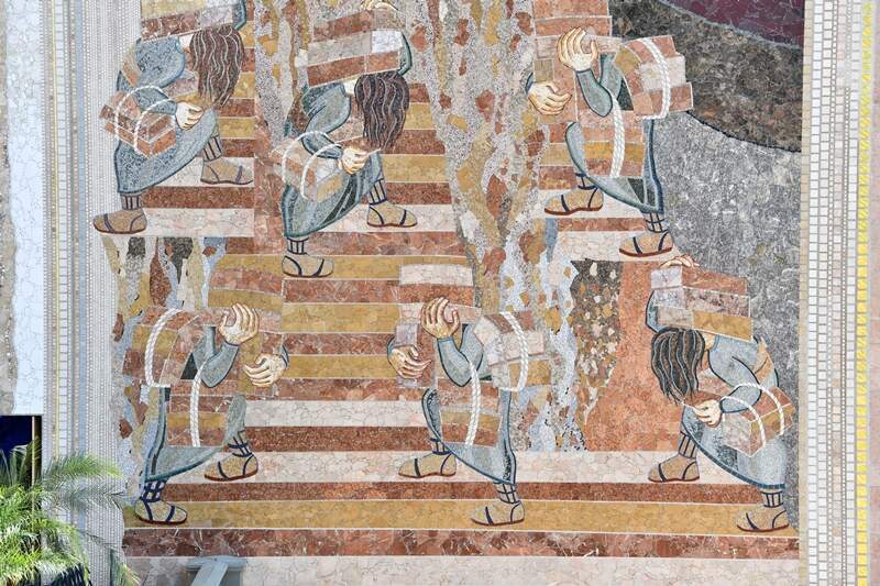 Vemos a construção da torre de Babel, com tijolos que são carregados para cima, que chegam até o cálice onde está Noé. O homem quer chegar aos céus, quer chegar a Deus, mas exprime o total individualismo. É por isso que não vemos os seus rostos, porque o verdadeiro motivo dessa construção é a busca pelo poder e pela autoafirmação. A relação entre Deus, o homem e a criação no amor foi perdida. No orgulho de chegar a Deus o homem rompe a comunhão. A competição entre os trabalhadores faz surgir a incompreensão e a confusão, na forma da criação de diversas línguas e dos pés virados, porque já não sabem mais para onde ir.