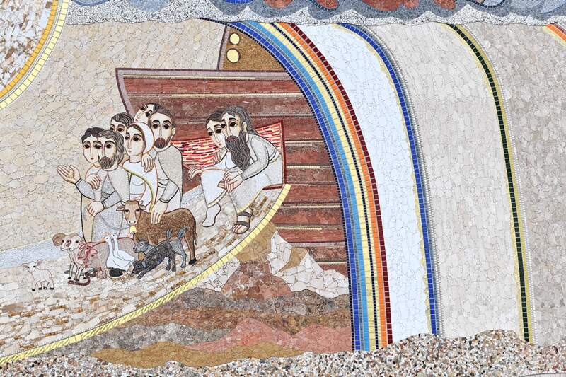 A arca parece ter saído de uma onda de luz, e agora, em terra firme, se abre para a saída dos homens e dos animais em direção a uma nova vida. A porta da qual estão saindo tem a forma da ferida do lado de Cristo. É a imagem que lembra a dimensão de uma nova criação, e por isso se liga com a criação de Adão e Eva na parte frontal da fachada. Os casais que saem da arca estão unidos porque, de fato, se encontraram no amor de Deus que os salvou. Assim como na cena da criação Adão e Eva vão um em direção ao outro e se encontram em Deus. É a imagem da aliança tendo o arco na nuvem como sinal.