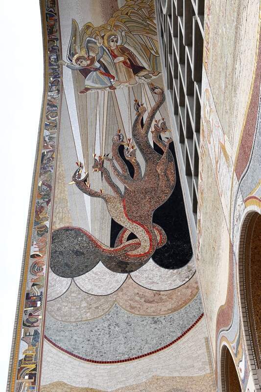 No céu, o dragão foi derrotado por Miguel, que o destrói. O mosaico nos apresenta Miguel com uma lança muito fina, mas com a força de Deus ele faz o dragão precipitar sobre a terra e a batalha é na terra. À frente do Dragão está o deserto, porque onde há o mal não há a vida. A mulher voa para o deserto, onde será provada, mas Deus proverá.