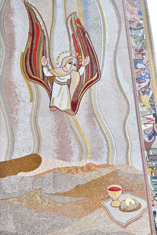 A mulher que é levada para o deserto é a imagem da Igreja, que nos oferece a cada eucaristia pão e vinho para nos fortalecer na batalha que continua contra o dragão e seus anjos. Mas o mal do mundo é vencido (cf. Jo 16,33). De fato, logo atrás desse mosaico da Mulher levada para o deserto está o sacrifício de Isaac, no qual, de fato, Abraão, pela fé, sabe que Deus proverá.