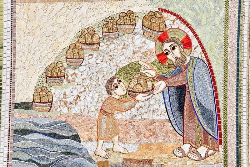 Um menino oferta cinco pães. Qual o significado dessa oferta (cf. Jo 6,1-11)? Tudo aquilo que se entrega a Cristo muda de qualidade e de quantidade. De fato, do grão não se vive, é necessária a farinha, a água, e é necessário o fogo. Tudo isso deve entrar em Cristo e na sua Páscoa. O pão oferecido a Cristo na Eucaristia se torna alimento para a vida eterna. Nós vivemos a Criação de modo litúrgico, eucarístico, a Nova Criação.