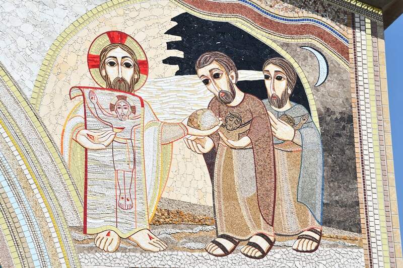 O episódio escolhido para ilustrar o mosaico fala dos dois discípulos de Emaús que depois de terem ouvido, ou talvez, terem visto de longe a crucificação de Cristo estão convencidos de que seu Mestre morreu, tudo acabou. Com essa mentalidade, o próprio Cristo ressuscitado se aproxima dos dois viajantes, mas eles não O reconhecem.