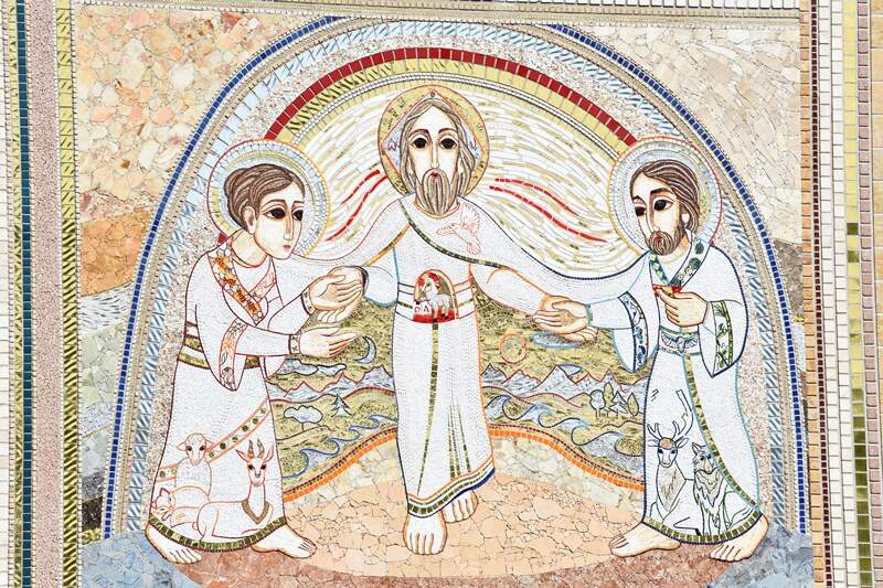 Ao centro, um pergaminho estendido do vitral ao arco dos capitéis: a Palavra se fez visível e nós vemos o Filho de Deus com as mãos abertas apontando para baixo porque por meio d’Ele o mundo está se criando, mas o Filho tem o olhar voltado para o Pai. E sob as suas mãos se encontra o Espírito Santo que paira sobre as águas.