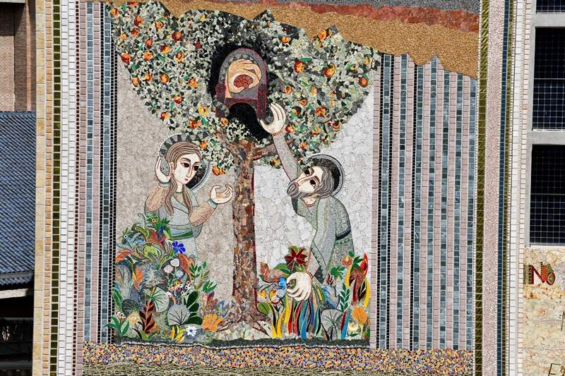 O mosaico nos mostra Eva dialogando com a serpente que lhe apresenta Deus como alguém poderoso, mesquinho, que possui e quer tudo só para si mesmo. Um deus ciumento de suas criaturas, de suas árvores, ou seja, de si mesmo. É no coração da árvore do conhecimento do bem e do mal que a serpente, com sua cauda, manifesta a mão, como se fosse um deus, cheia dos frutos da terra. Observem que a mão está sobre um trono, cujo significado é o poder, como se o conhecimento do bem e do mal colocasse um poder na mão. No entanto, a questão é que esse conhecimento é separado da vida, é separado da árvore da vida e, portanto, não leva à vida, mas à morte.