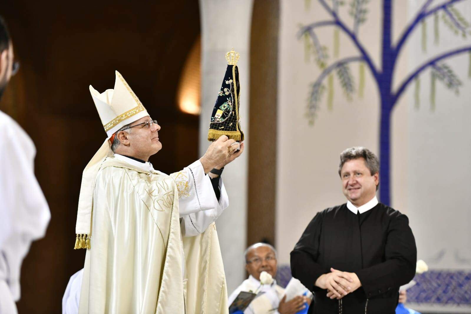 Saúdo com alegria, com afeto, Dom Orlando, digníssimo arcebispo dessa arquidiocese. Saúdo o Padre Eduardo, reitor do santuário. Na pessoa dele, saúdo todos os padres redentoristas. Saúdo o Padre Marlos, provincial. Saúdo todos os padres aqui presentes, saúdo com alegria, com afeto, a cada um.