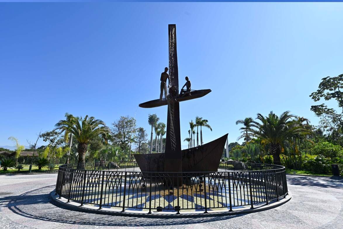 A simbologia presente na Capela também se expande para as demais áreas do Porto Itaguaçu. Já na entrada do espaço o Monumento aos Três Pescadores acolhe quem chega no local. “Essa obra de arte belíssima nós propusemos para que fosse esse ponto de chegada”, conta Tobias.