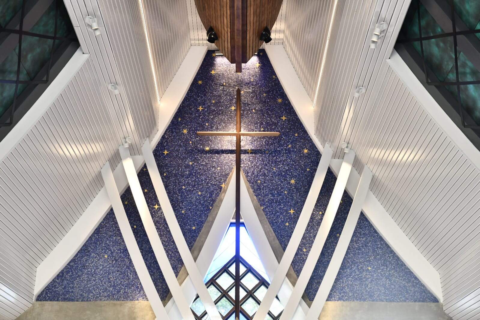O formato do forro do templo recorda o fundo de uma embarcação e apresenta losangos metálicos, que fazem alusão às redes dos pescadores. “Como que no momento da pesca”, traduz o arquiteto.