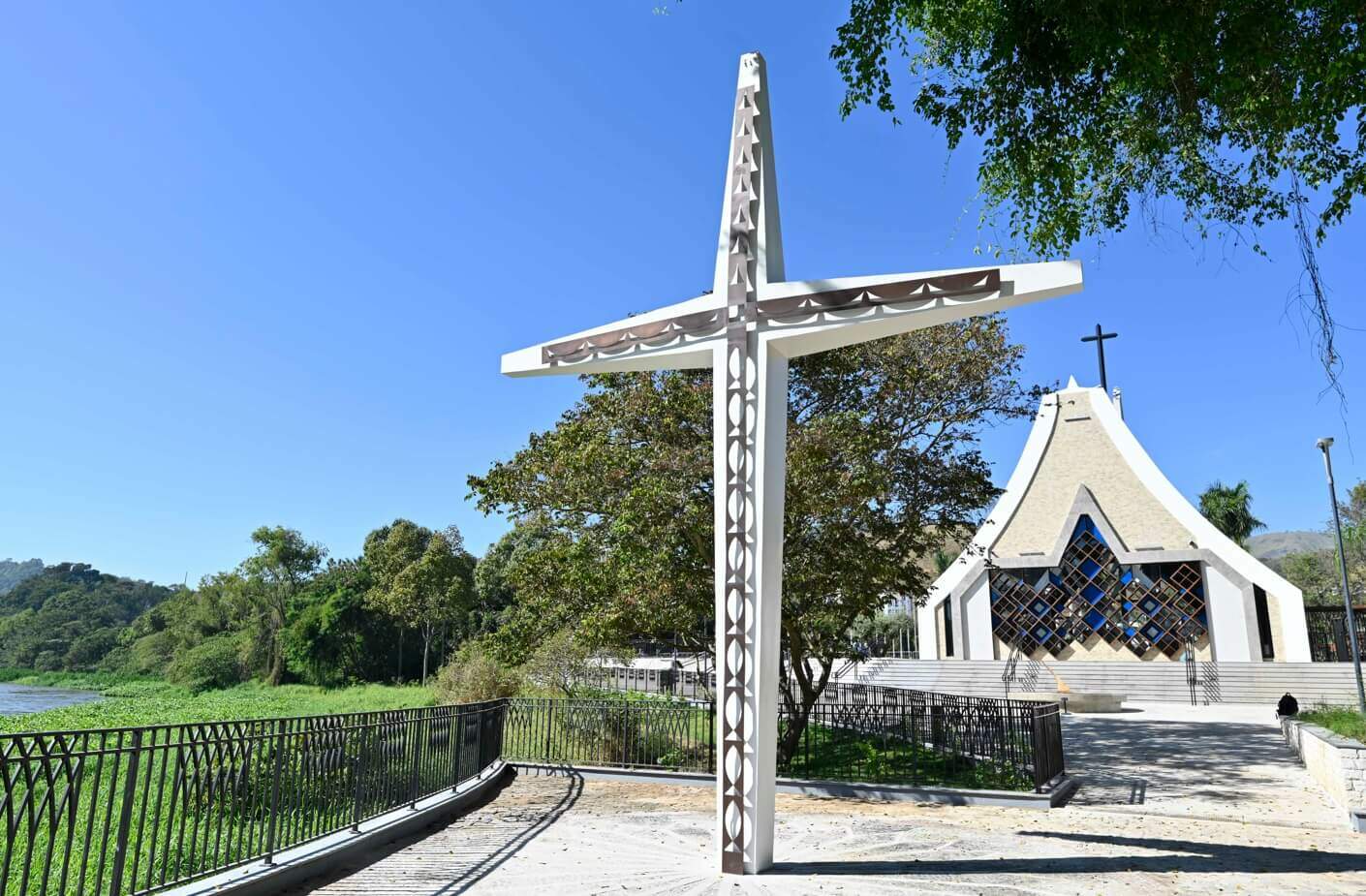 Atrás da Capela, o Mirante do Rio Paraíba do Sul, no exato local da pesca da Imagem, apresenta a Cruz do Encontro, que ganhou uma marcação em metal com peixes. “As iniciais da palavra peixe em grego: Jesus Cristo salvador do mundo. Então nós temos essa simbologia que vem desde a arte paleocristã e que nos traz tantas referências bonitas e aqui ela se une às águas do Paraíba, junto dos peixes do Paraíba Sul, mas também é o próprio Cristo que se apresenta”, relata.