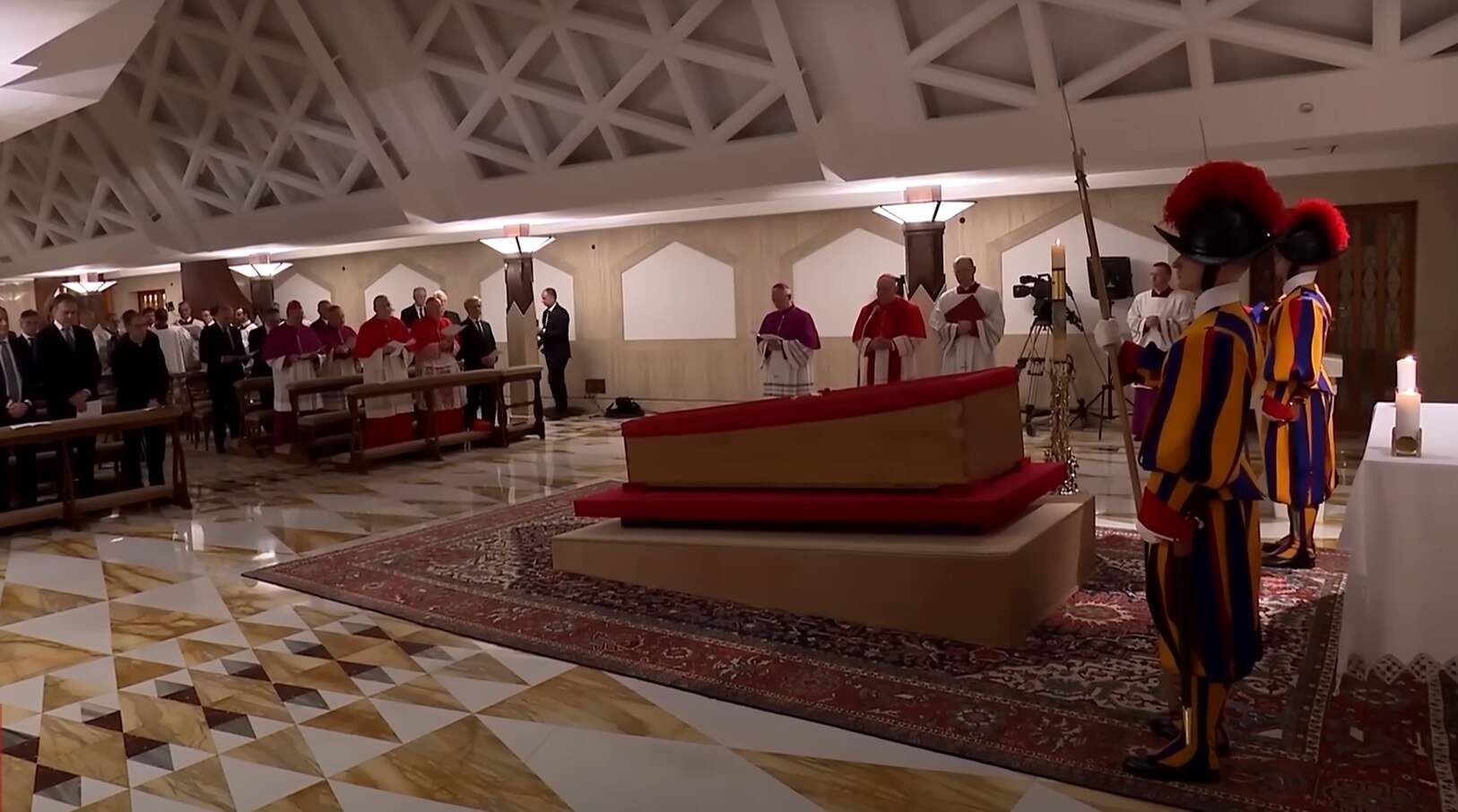 A constatação da morte, antes feita no quarto do papa, agora foi realizada na Capela da Casa Santa Marta, localizada no prédio em que Francisco vivia no Vaticano. O corpo do pontífice defunto foi colocado no caixão neste local, sem ser conduzido para o Palácio Apostólico, como era o costume nos pontificados anteriores. O prédio do Palácio é visível da Praça de São Pedro e, de uma de suas janelas, os pontífices recitam a oração do Ângelus.