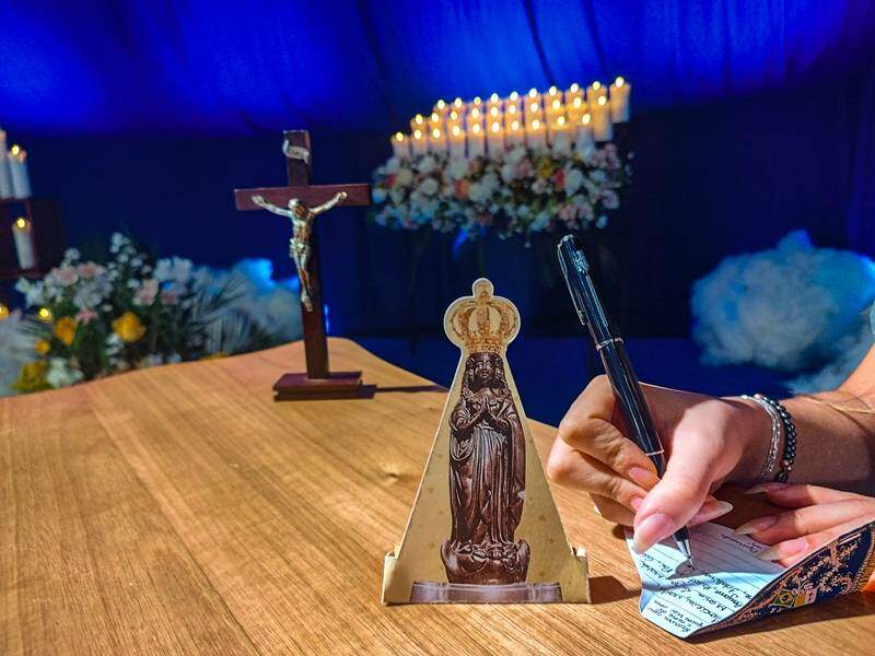 Além disso, você recebeu uma ficha impressa pela qual pode nos enviar, pelo Correio, as suas intenções, ou acessar a página A12.com/mantodeamor e nos encaminhar uma mensagem que será entregue a Ela no dia 31 de outubro, durante uma celebração especial na Capela dos Apóstolos, localizada atrás do Nicho da Imagem de Nossa Senhora Aparecida.
