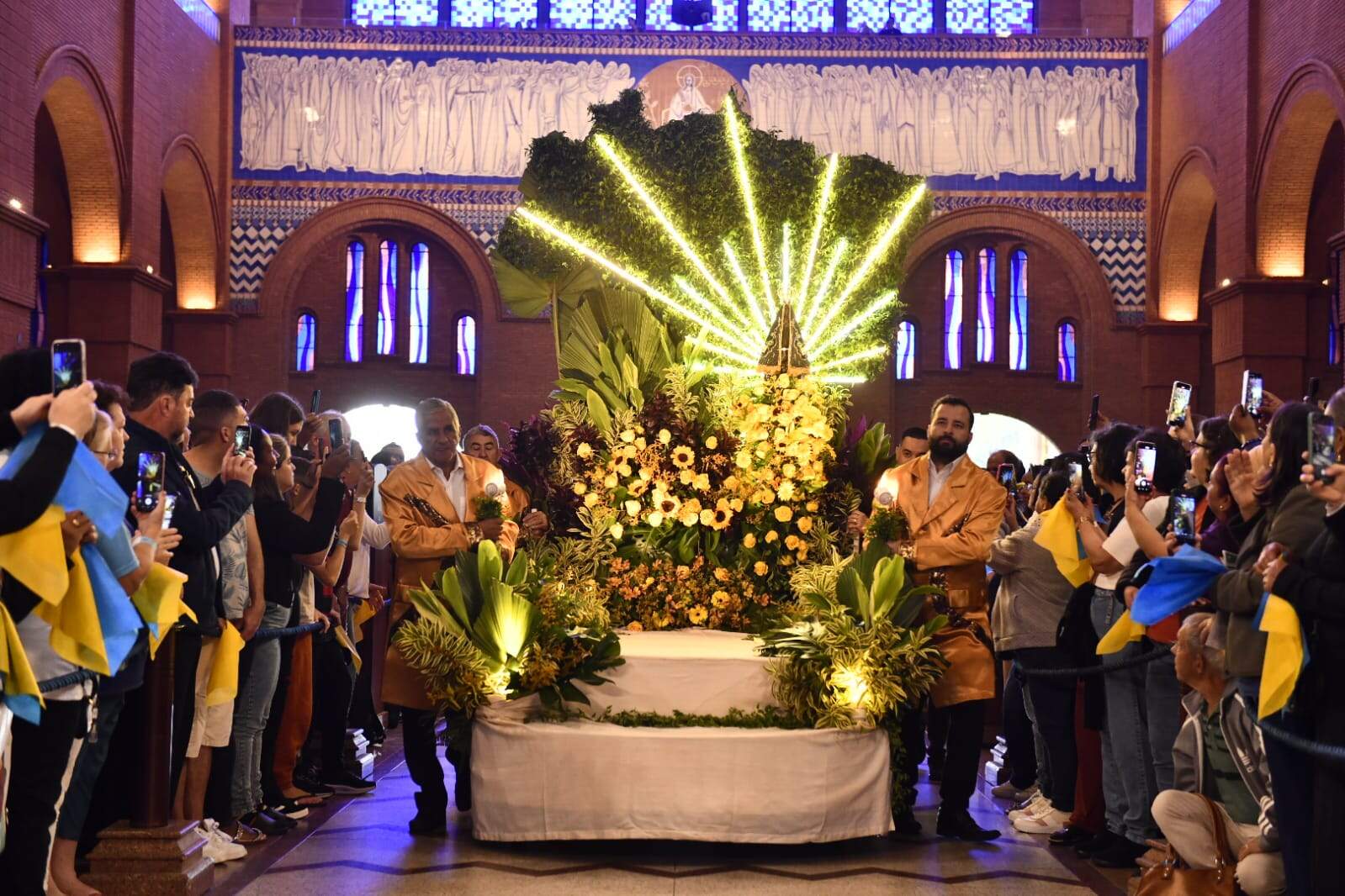 Esta presença foi ainda mais visível desde o início da celebração. Com lenços azuis e amarelos, a multidão de romeiros saudou a imagem de Nossa Senhora Aparecida, entronizada junto das bandeiras dos estados brasileiros e do Distrito Federal. No carro andor, um mapa do Brasil trazia, em seu centro, a Padroeira, rodeada por luzes.