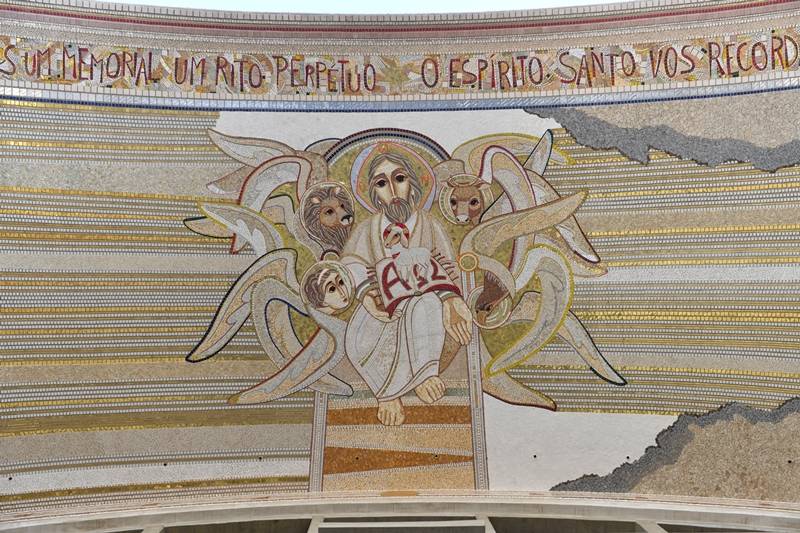 Imagem do livro de Daniel, retomada pelo Apocalipse: em 4,2.6-8, por exemplo, o Ancião é “aquele que vive pelos séculos dos séculos” (v.10s). É a liturgia celeste, após a vitória final de Deus sobre toda iniquidade da História. O Ancião é o Pai e, sentado no trono, é o Senhor único e absoluto de tudo. Essa cena, na Fachada, tem um enriquecimento espetacular. O Pai entronizado tem no colo – tão centrado como Ele mesmo na Fachada – o Cordeiro imolado, ladeado das duas letras gregas que o definem: Alfa e Ômega. Realce a Jesus em sua vida-missão encarnada, sobretudo na paixão e morte. A vitória do Pai é igualmente de Jesus.
