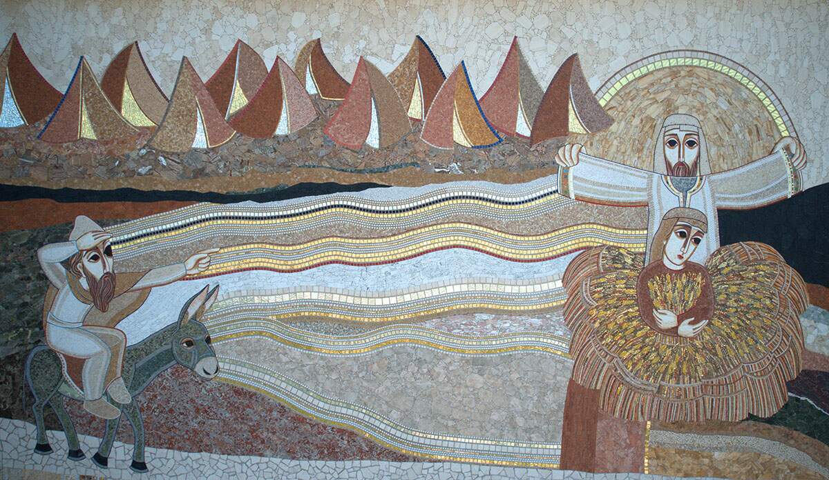 No terceiro dia, separando as águas da terra, Deus também ordena à terra produzir brotos. O mosaico nos apresenta a multiplicação dos pães.