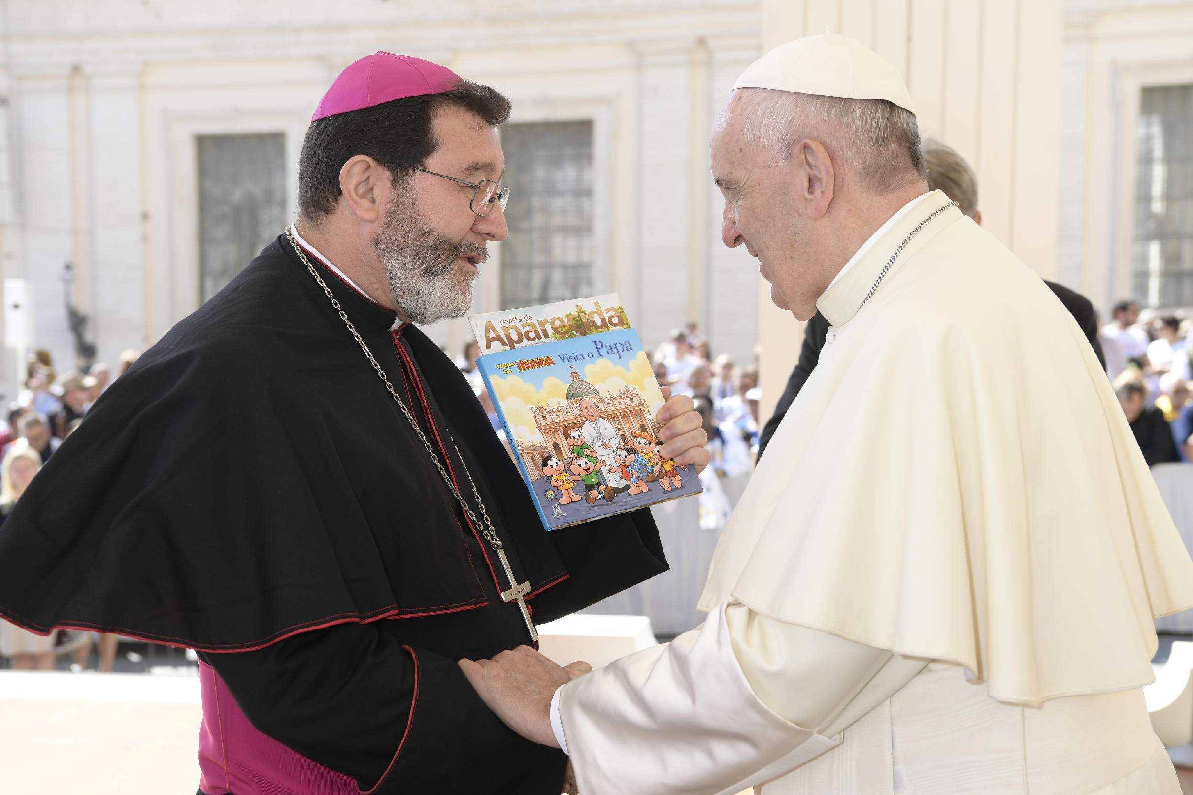 Na última semana, o Bispo Dom Joercio Gonçalves, C.Ss.R., esteve no Vaticano, em Roma, com a Vossa Santidade, o Papa Francisco, e presenteou-o com o Livro Turma da Mônica visita o Papa. Segundo o bispo, o Papa sorriu ao ver o seu próprio desenho na capa do livro. Ele também aproveitou o momento para dizer as seguintes palavras ao Papa: “Vossa Santidade é uma grande bênção para nossa Igreja. O povo o ama! ”