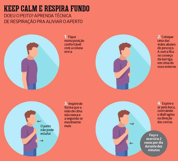 Para não ter um piripaque, uma técnica infalível é fazer a respiração abdominal (veja o passo a passo abaixo). Alguns minutos por dia já são suficientes para aliviar a tensão, oxigenar o cérebro e relaxar a musculatura. Agora sabemos que há muita ciência por trás daquele conselho popular que diz para “respirar e contar até dez”.