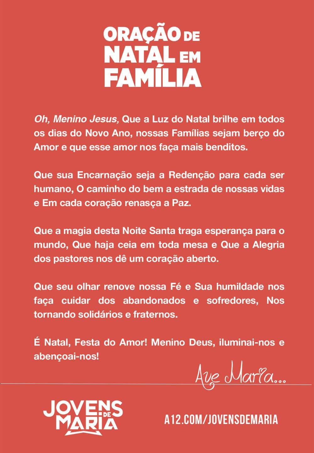 Natal é sempre dia de alegria, de festa, de reunir toda a família! E em meio às comidas, presentes, conversas e muita risada, às vezes, nos esquecemos de parar um minuto sequer para rezar. Pensando nisso, o Jovens de Maria preparou uma rápida oração que você pode rezar junto com sua família nesse dia especial.
