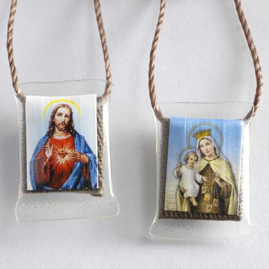 Anos mais tarde, foi feita uma adaptação para que os leigos também pudessem usar e era da seguinte maneira: dois pedaços de pano ligados por um cordão; um com a imagem de Nossa Senhora do Carmo e outro com a imagem do Sagrado Coração de Jesus.