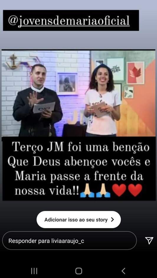 “Estou muito feliz em ter participado do terço! 🙏🙏 Desde pequenininha, sou muito devota de Nossa Senhora Aparecida e gostaria de dar um testemunho que aconteceu nesse terço 🙏🙏😭❤❤