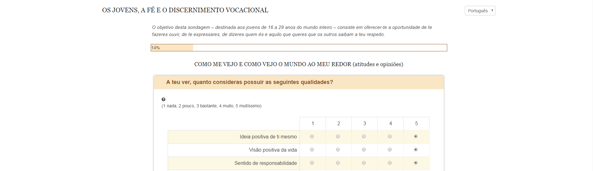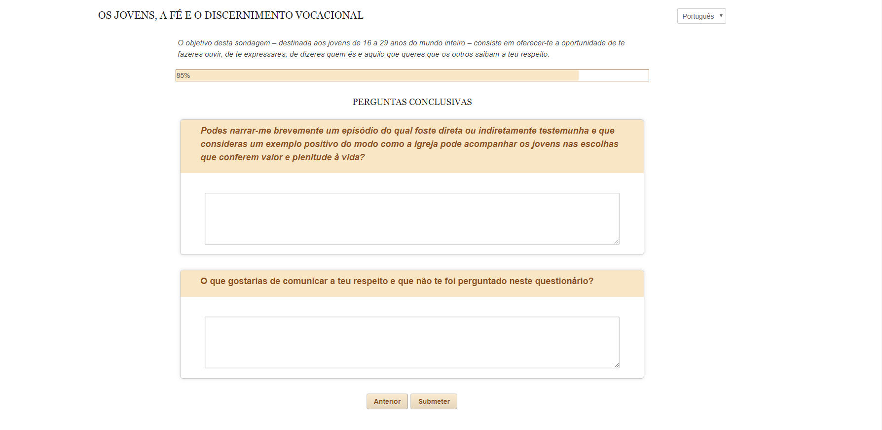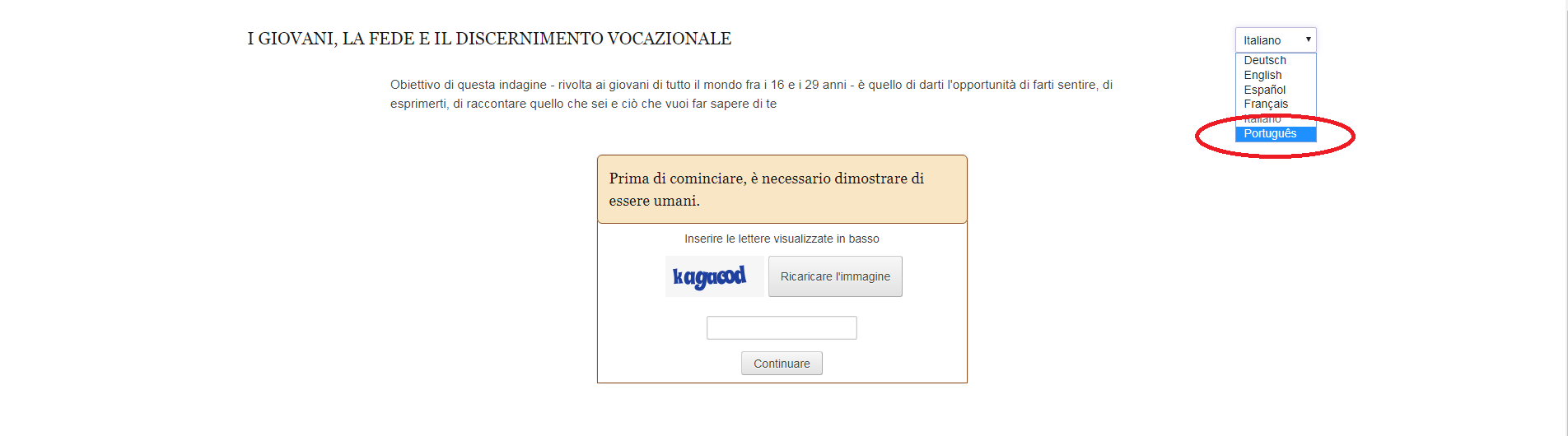 O questionário é direcionado a jovens de 16 a 29 anos do mundo inteiro nas línguas italiana, inglesa, francesa, espanhola e portuguesa.