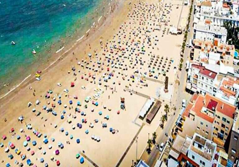 Imagens gravadas por um drone na Praia de Regla, em Chipiona, mostram que há marcadores horizontais com 5 metros de distância para guiar os banhistas. As pessoas devem ficar em frente a esses marcadores e contar seis passos de distância.