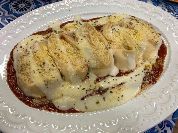 Coloque em uma assadeira com corte para cima e despeje molho de tomate ou molho branco, conforme sua preferência.