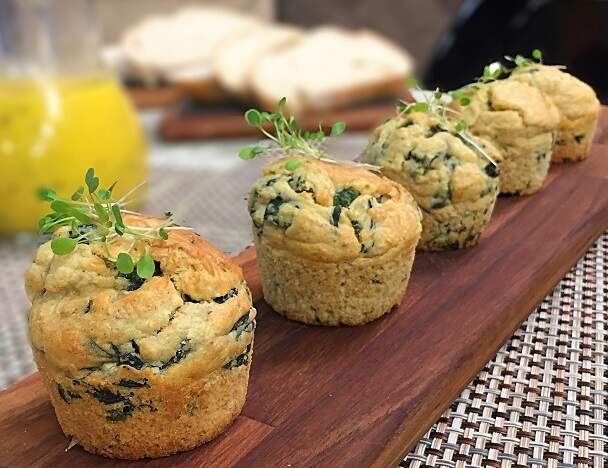 Coloque as forminhas para muffin e decore com os tomates cereja. Asse no forno alto a 180 graus, de 20 a 25 minutos.