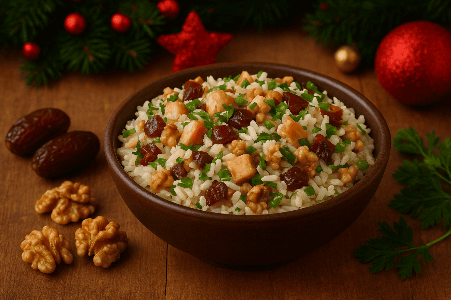 A receita ganha aquele toque especial com nozes crocantes, frango bem temperado e tâmaras que trazem uma doçura equilibrada e festiva ao prato. Uma combinação simples, mas cheia de charme natalino, do jeito que todo mundo gosta.