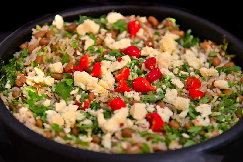 Coloque o azeite em uma panela, todas as carnes e deixe refogar bem. Coloque o alho, a parte branca da cebolinha, o alho-poró e a cebola. Deixe refogar. Coloque os pimentões e cozinhe até ficar levemente dourado. Coloque o feijão cozido, o arroz cozido, misture tudo e finalize com o queijo coalho em cubos, azeite de urucum e cebolinha.