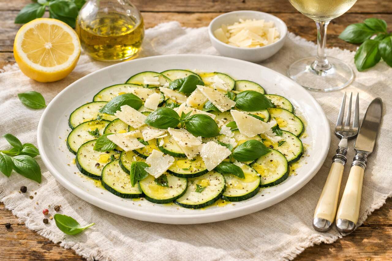 Disponha a abobrinha no prato, regue com o limão e o azeite, tempere e finalize com parmesão e ervas.