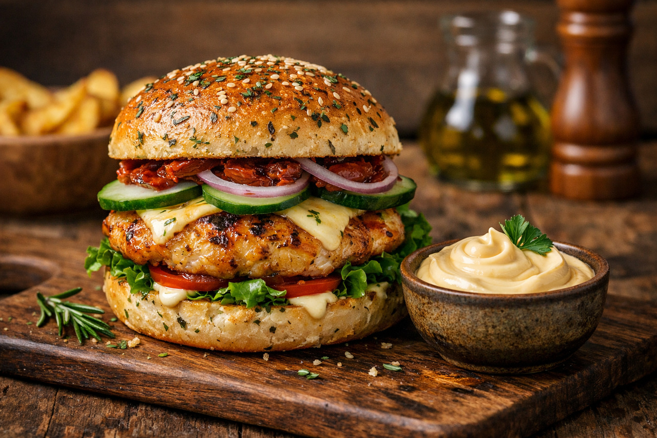Para acompanhar o pão de ervas, vem aí um Hambúrguer Mediterrâneo preparado com sobrecoxa de frango. Suculento, bem temperado e cheio de personalidade. A combinação com o pão é simplesmente perfeita. Equilíbrio entre leveza, sabor e aquele toque especial que surpreende. Ah, e ainda tem maionese caseira para completar o combo!