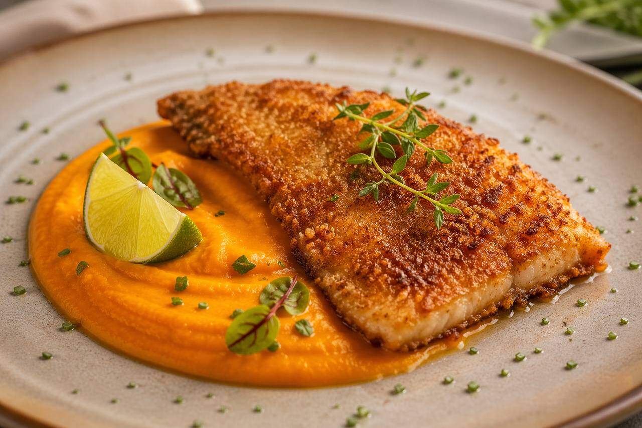 Desta vez, o prato principal é uma tilápia. Um preparo com empanamento extremamente crocante, daqueles que fazem barulho a cada mordida e entregam sabor do começo ao fim. Para acompanhar, entra o purê de cenoura, cremoso, delicado e cheio de sabor. Ele não é apenas um coadjuvante, mas o complemento perfeito que equilibra o prato, criando uma combinação harmoniosa e surpreendente.