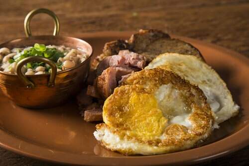 Guarnições: arroz branco, couve refogada, bisteca de porco com osso assada ou frita, ovos fritos em manteiga, salada de tomates com cebolas, bananas maduras e firmes, fritas à milanesa, linguiças frescas assadas ou fritas.