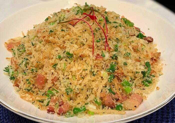 Aqueça o óleo e frite o bacon, ajuste o sal e a pimenta. Depois de bem frito, retire do fogo, junte a farinha e o coco e misture bem. Sirva em seguida.