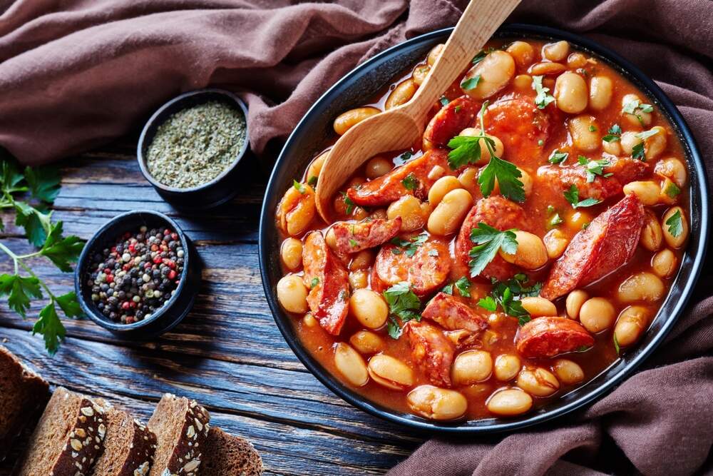 Numa panela refogue os ingredientes pela ordem, junte a linguiça e o paio e deixe cozinhar. Quando tudo estiver bem cozido, junte o feijão, o caldo, ajuste o sal e a pimenta e deixe cozinhar por 10 minutos. Sirva em seguida.