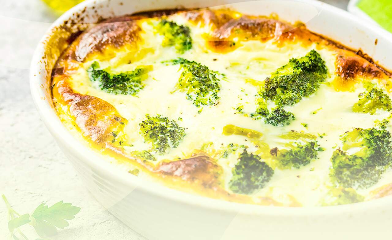 Refogue o Brócolis em alho e azeite e coloque em refratário untado com manteiga. Reserve. Para o creme, coloque todos os ingredientes no liquidificador e bata por 2 minutos. Coloque sobre o Brócolis, polvilhe com queijo e leve ao forno até dourar.